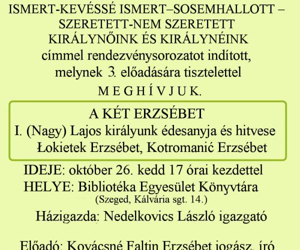 A Bibliotéka Egyesület a Szegedi Közéleti Kávéházi Esték Alapítvány a Csongrád Megyei Honismereti Egyesület a Civil Szeretet Kurázsi Társaság "ismert-kevéssé ismert-sosemhallott - szeretett-nem szeretett királynőink és királynéink" címmel rendezvénysorozatot indított, melynek 3. előadására...