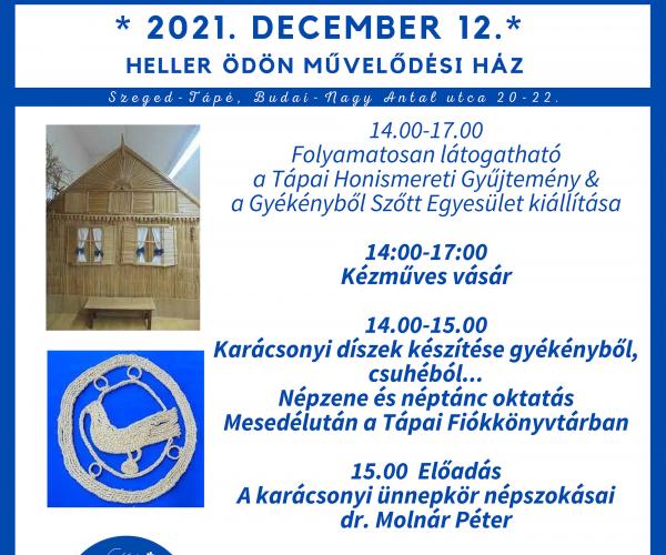 2021. december 12-én Szeged-Tápén Tápé hagyományaival ismerkedhetünk Molnár Mária tagtársunkkal, és gyékényből karácsonyi díszeket készíthetünk. Ugyanekkor megvásárolható lesz Kerekes Ibolya tagtársunk Elhaladt az idő c. könyve is.