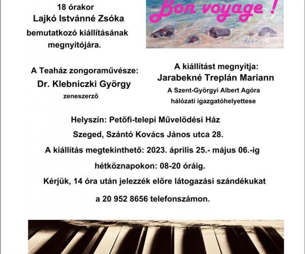 2023. április 25-én 18 órakor Lajkó Istvánné Zsóka bemutatkozó kiállításának megnyitójára.