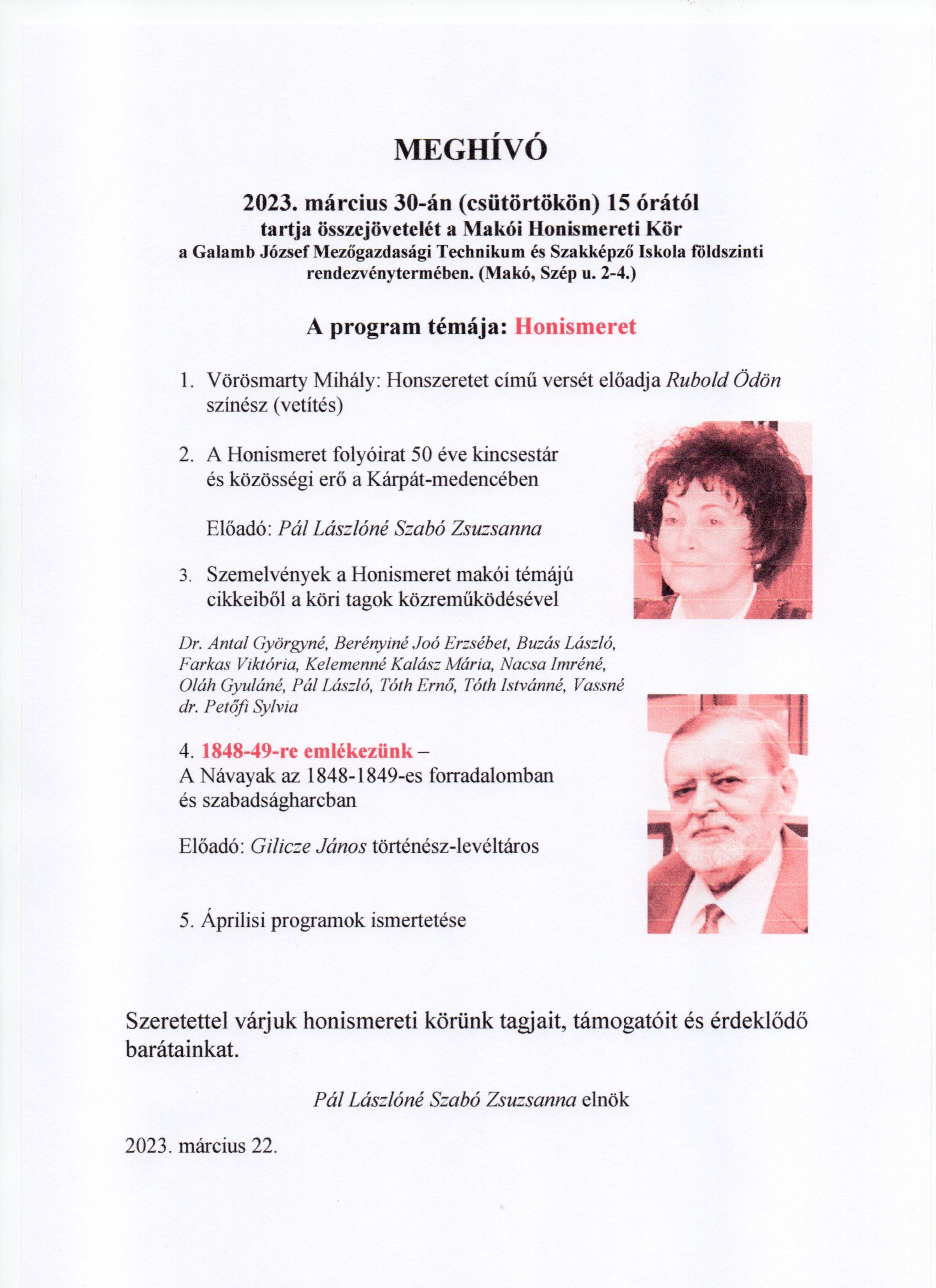 A Makói Honismereti Kör márciusi rendezvényére várja tagjainkat Kategória: Tagjaink által szervezett programokMakó – Kiszombor térsége 2023. március 30-án (csütörtökön) 15 órától tartja összejövetelét a Makói Honismereti Kör.