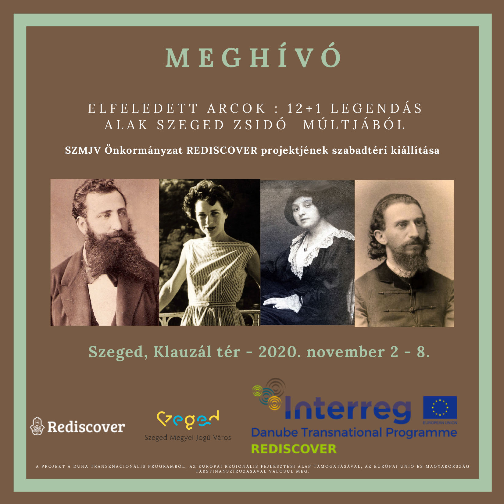 Meghívó Dátum: 2020. november 2-8.Kategória: CSMHE hírei, programjai Elfeledett Arcok: 12+1 legendás alak Szeged zsidó múltjábólSzeged, Klauzál tér - 2020. november 2-8.SZMJV Önkormányzat REDISCOVER projektjének szabadtéri kiállítása