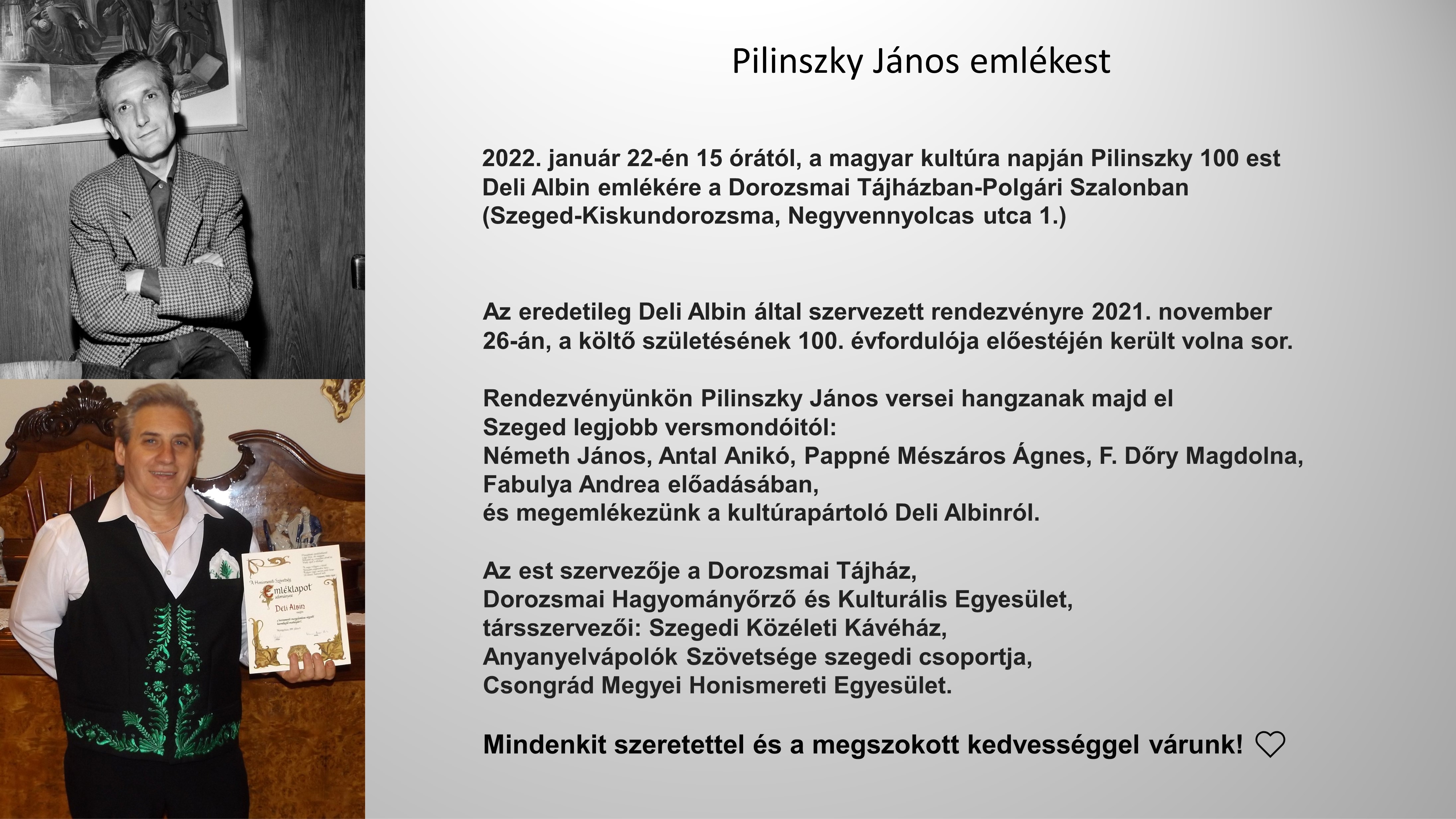 PILINSZKY JÁNOS EMLÉKEST DELI ALBIN EMLÉKÉRE PILINSZKY JÁNOS EMLÉKEST 2022. január 22. (Szombat) 15:00-tól, Kiskundorozsmán a magyar kultúra napja tiszteletére és Pilinszky János születésének 100. évfordulója alkalmából versmondó délutánt tartottak. Helyszín: Szeged-Kiskundorozsma, Negyvennyolcas u.1. Helytörténeti és Kulturális Szalon. Házigazda, a Dorozsmai Hagyományőrző és Kulturális Egyesület. Deli Julianna köszöntötte a vendégeket. MŰSOR: Pilinszky Jánosról való megemlékezést János Németh „Apokrif c. versel nyitotta meg. Dr Marjanucz László- a Csongrád Megyei Honismereti Egyesület elnöke – megemlékezése Deli Albin-ról . Németh János –Megemlékezése Deli Albinról, Pilinszky János: Késő kegyelem- Mondom neked- Egy szenvedély margójára-Tanúk nélkül -Halak a hálóban c. verseket szavalta el. Richárd Márton-Pilinszky János: Néhány szó a szavakról c. verset szavalta el. Henriett Papp-Pilinszky János: Múltunk reménye c. verset szavalta el. Anikó Antal- Pilinszky János: Azt hiszem- Áldott szédület- Kihült világ -Örökkön örökké- Őszi cirkusz c. verseket szavalta el. Ágnes Pappné Mészáros- Pilinszky János: Magamhoz- Könyörgés- A francia fogoly c. verseket szavalta el. F. Dőry Magdolna-Pilinszky János: Szegedi képeslap -Kánikula -Ne félj -Őszi csendélet -Igen és nem c. verseket szavalta el. Az est szervezője: Dorozsmai Tájház, Dorozsmai Hagyományőrző Kulturális Egyesület, A Szegedi Közéleti Kávéház kedvelői, Anyanyelvápolók Szövetsége szegedi csoportja, Csongrád Megyei Honismereti Egyesület. A műsort Németh János, a Szegedi Alkotó Kör elnöke vezette. A rendezvényen közel 60 fő vett részt és 21 verssel emlékeztek meg. Az eseményen Csaba Komáromi által bemutatásra került a kiskundorozsmai 524. számú Prohászka Ottokár cserkészcsapat történetét bemutató könyv is, mely az esemény végén megvásárolható volt. A műsor végén sajtos pogácsával, házi készítésű sós, köményes kiflivel, teával, kínálták a vendégeket. Segítettek: Víg Ágota, Kiss László Zsolt, Bakos-Vig Hanna, Deli Julianna, Deli Alen , Deli Alex, A rendezvény támogatói: Csongrád Megyei Honismereti Egyesület, Szélmalom Vendéglő, Alex Divatház, Szurdi Bence, Edit Nagyné, Csiszár Katalin, Sisákné Ica, Mária Gergelyné Bodó, Éva Zuborné, Maryn Nagy és Bakos-Víg Hanna. Köszönet a rendezvény szervezőinek, Kati Nemethne felkészítő tanárnőnek, versmondóknak, képviselő uraknak, hölgynek akik jelenlétükkel megtisztelték a rendezvényt Hekáné Szondi Ildikó képviselő Asszony, Dr. Fodor Antal képviselő Úr és Mihálik Edvin az ellenzék közös országgyűlési képviselőjelöltje Szegeden és a Homokhátságon, a rendezvény résztvevőinek és mindazoknak akik támogatásával a magyar kultúra napja és Pilinszky János születésének 100. évfordulója alkalmából méltó megemlékező, színvonalas kulturális műsor jöhetett létre. Köszönet egy égi angyalnak Deli Albinnak, aki fentről segítette a munkánkat és mindig velünk van.