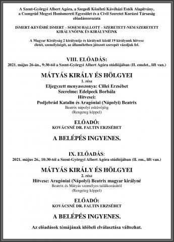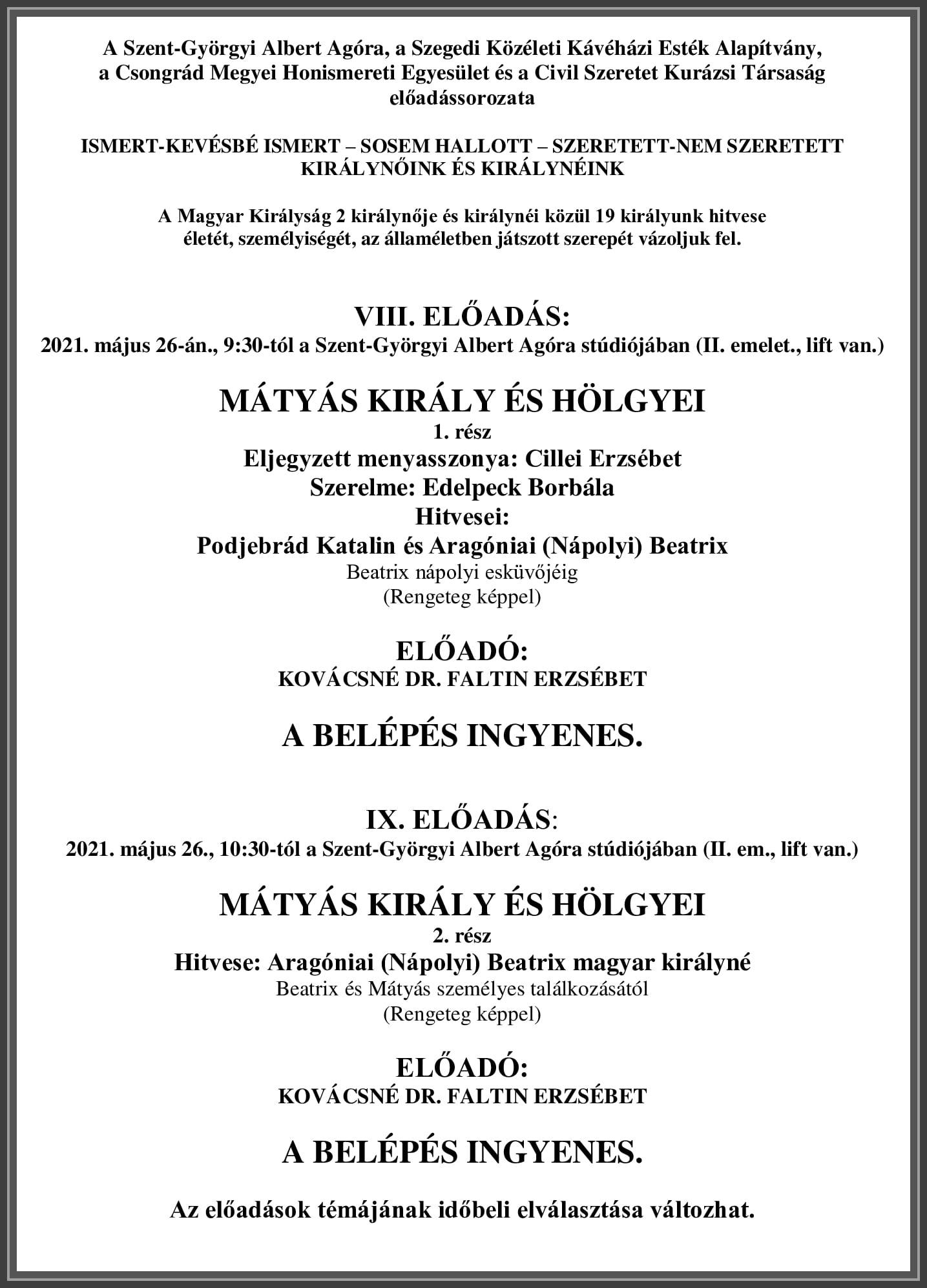 A Szent-Györgyi Albert Agóra, a Szegedi Közéleti Kávéház Esték Alapítvány, a Csongrád Megyei Honismereti Egyesület és a Civil Szeretet Kurázsi Társaság előadássorozata ISMERT - KEVÉSBÉ ISMERT - SOSEM HALLOTT - SZERETETT - NEM SZERETETT KIRÁLYNŐINK ÉS KIRÁLYNÉINK címmel, melynek 8. és 9. előadására ezennel tisztelettel meghívjuk.