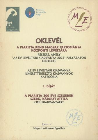 A Magyar Levéltárosok Egyesülete által hagyományosan kiírt Az év levéltári kiadványa pályázaton a 2022. év legjobb ismeretterjesztő kiadványainak kategóriájában (ide tartoznak a kiállítási katalógusok, albumok is) az 1. helyet a A Piarista: 300 éve Szegeden kötet nyerte el.