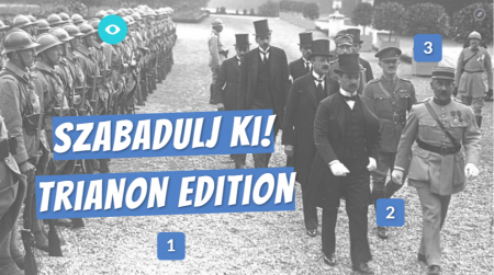 A járvány miatt kialakult helyzet következtében nemcsak a március 15-i megemlékezés lebonylítása lett rendhagyó, hanem a trianoni békediktátum aláírásának 100. évfordulója is. Arra gondoltunk, hogy egy szabadulószobás játékra invitálunk Mindenkit, melyet az alábbi linkre kattintva érhető el. A feladatot célszerű asztali gépen vagy laptopon megoldani, mivel néhány esetben új lap fog megnyílni és okostelefonon nehezebb visszakerülni a fő felületre. Célszerű a maximális vizuális élmény érdekében a jobb alsó sarokban lévő három pöttyre kattintva teljes képernyős módra váltani, ahonnan az "Esc" billentyűvel lehet kilépni. Rövid utasítások találhatók rögtön az elején, ezeket érdemes elolvasni, hogy ismert legyen, mikor mit kell csinálni, hova kell kattintani. Rossz válasz esetén az adott szoba elejére dob vissza a rendszer, nem az egészet kell újrakezdeni.