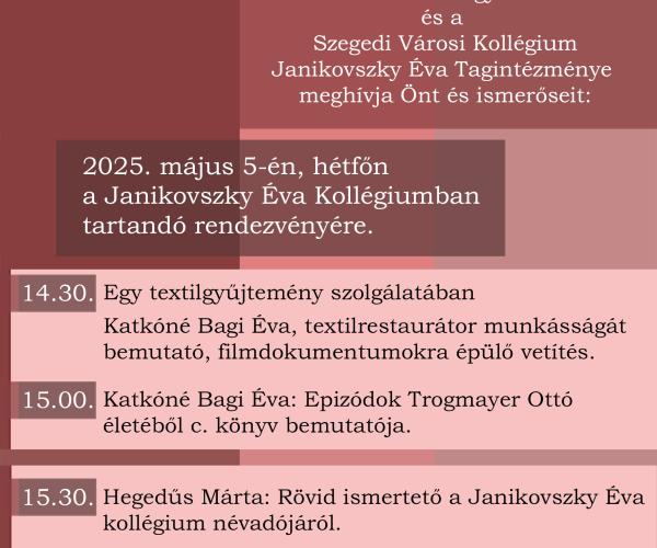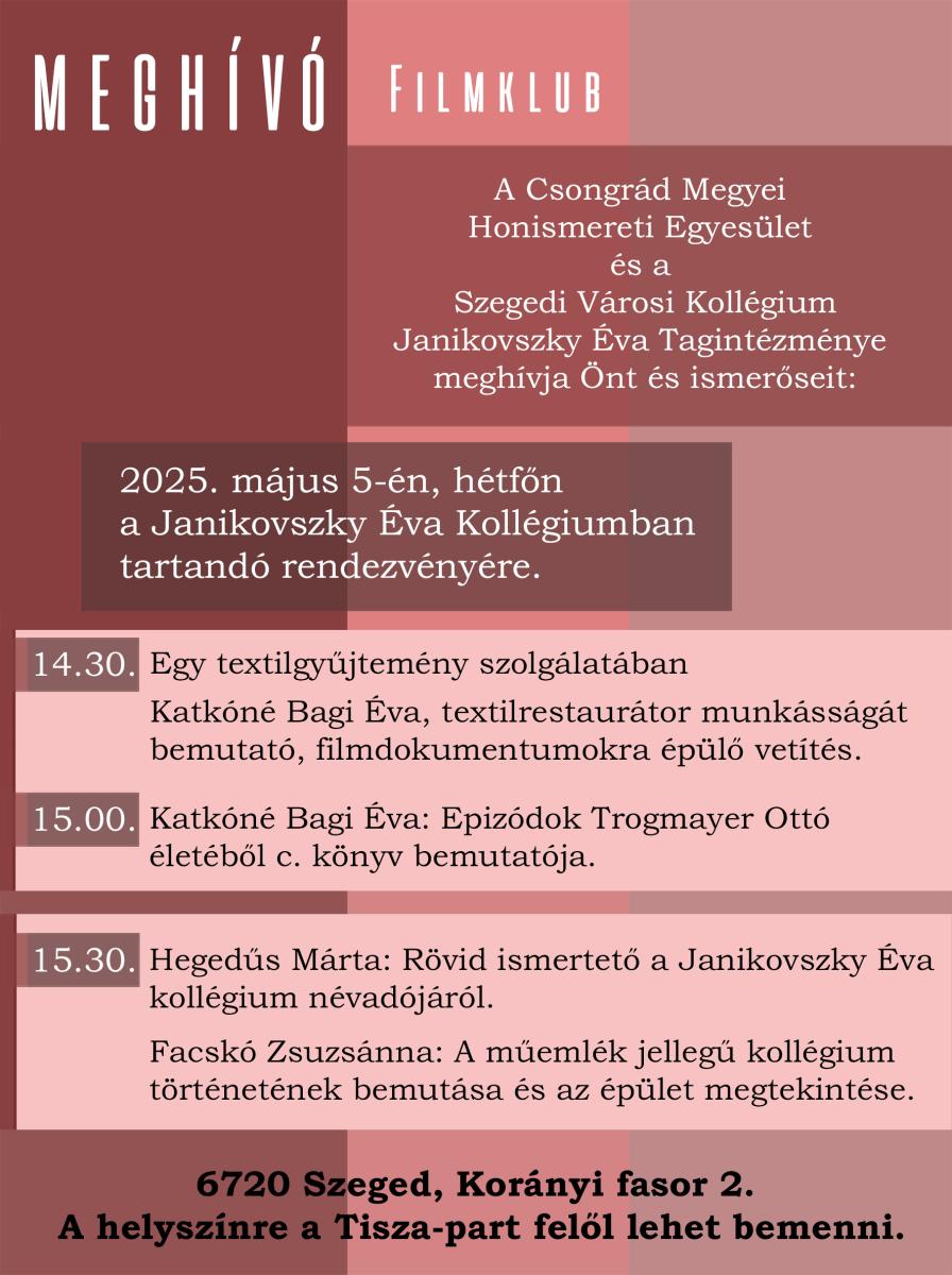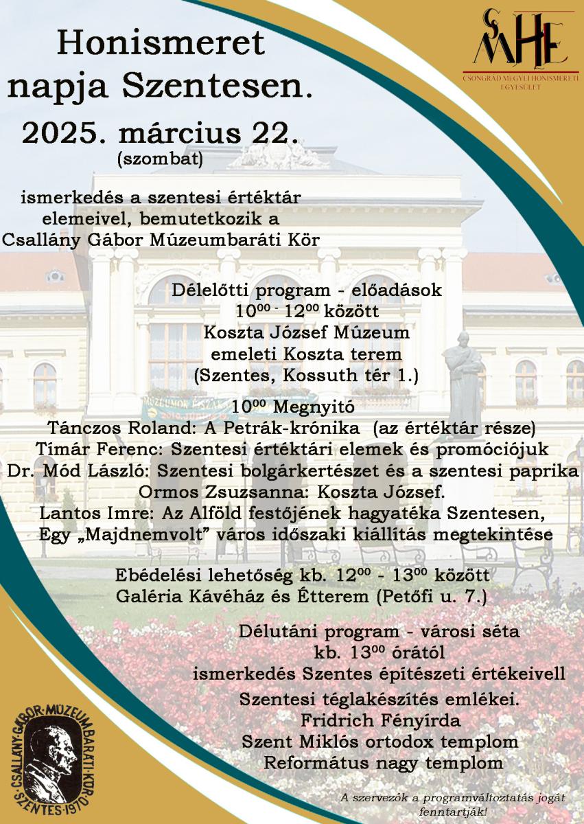 A Csongrád Megyei Honismereti Egyesület a 2024. évet záró közgyűlését 2025. február 1-jén, szombaton 10 órától tartja Szeged, Bölcsészettudományi Kar - BTK, Egyetem u. 2, 6722 alatt, a III. emeleti történész folyosó VII. termében.