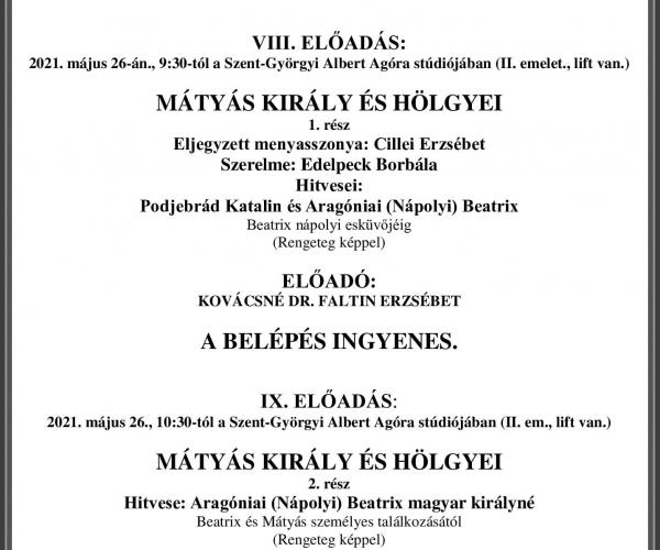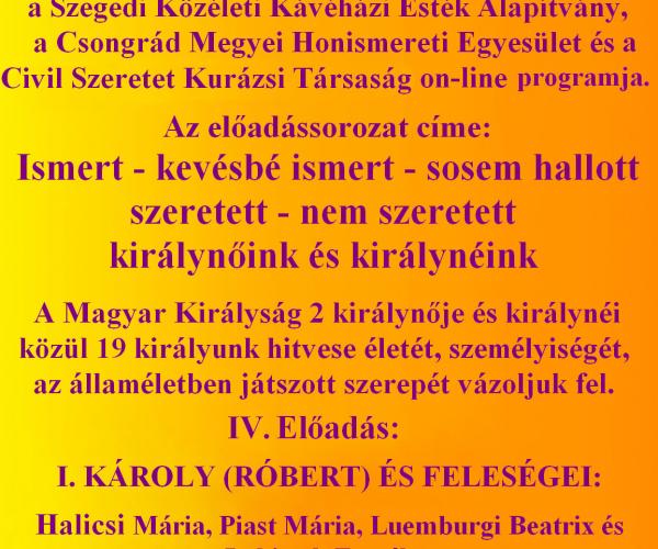 A Szent-Györgyi Albert Agóra, a Szegedi Közéleti Kávéház Esték Alapítvány, a Csongrád Megyei Honismereti Egyesület és a Civil Szeretet Kurázsi Társaság előadássorozata ISMERT - KEVÉSBÉ ISMERT - SOSEM HALLOTT - SZERETETT - NEM SZERETETT KIRÁLYNŐINK ÉS KIRÁLYNÉINK címmel, melynek 8. és 9....