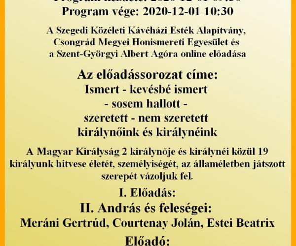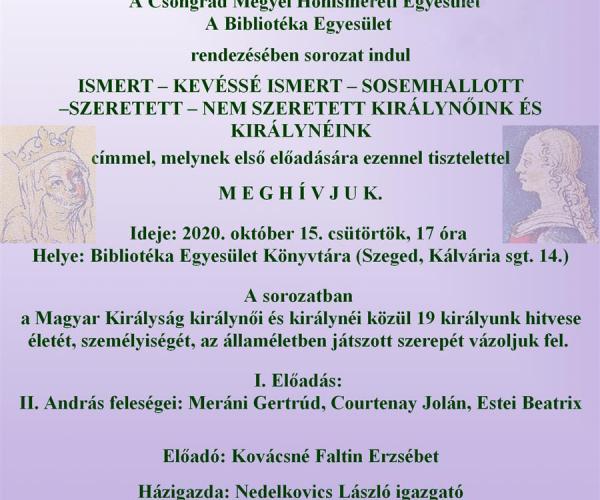 A Szegedi Közéleti Kávéház Esték Alapítvány A Csongrád Megyei Honismereti Egyesület A Bibliotéka Egyesület rendezésében sorozat indul ISMERT - KEVÉSSÉ ISMERT - SOSEMHALLOTT - SZERETETT - NEM SZERETETT KIRÁLYNŐINK ÉS KIRÁLYNÉINK címmel, melynek első előadására ezennel tisztelettel mghívjuk....